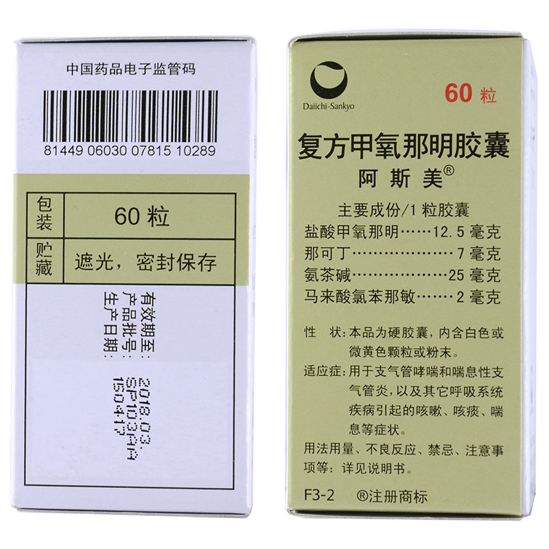 阿斯美复方甲氧那明胶囊60粒